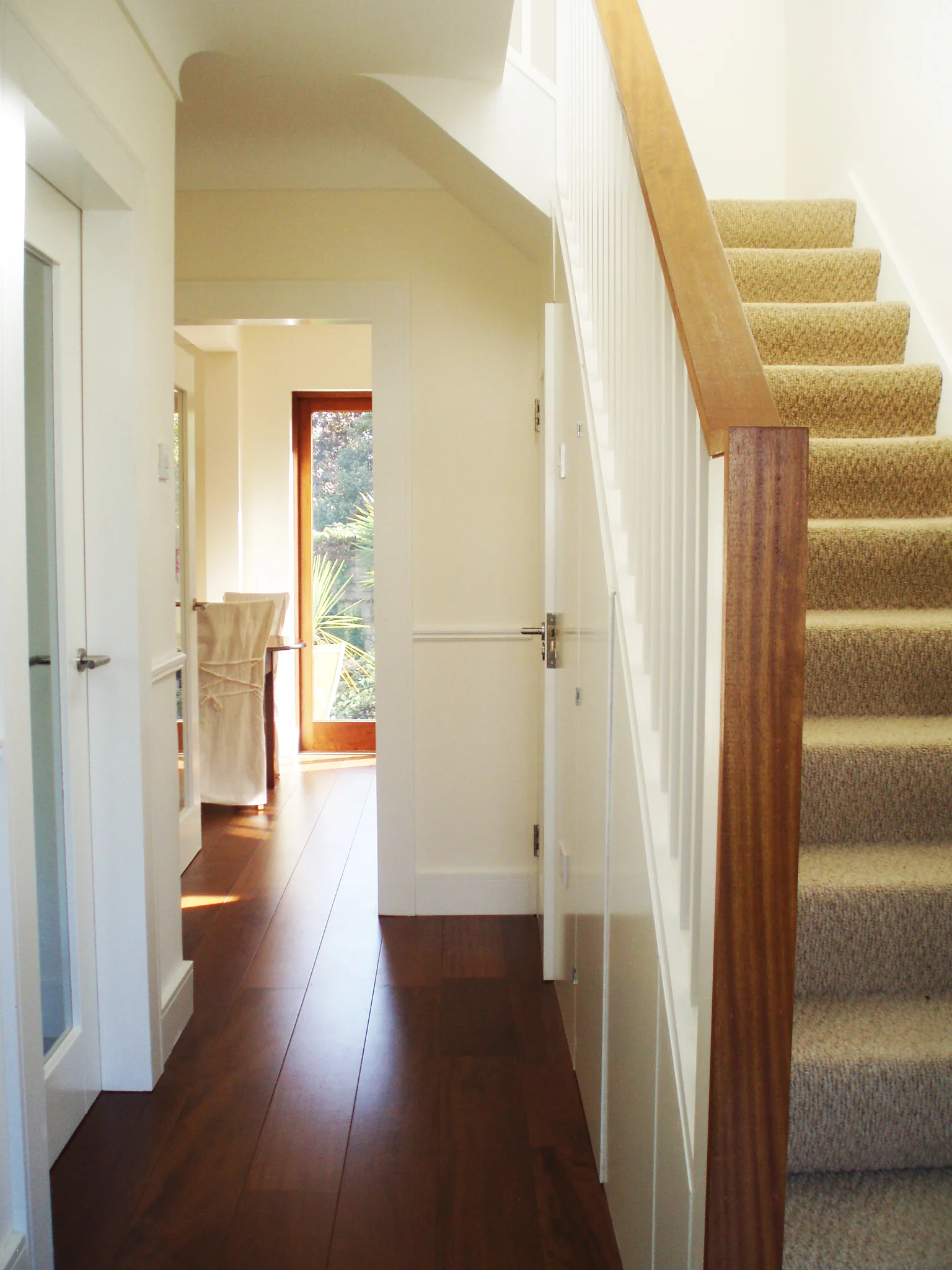The original 1970s timber and metal balustrade was removed and replaced with a painted timber uprights, topped with a hardwood iroko handrail, matching the new flooring and extending the material language up through the house.
